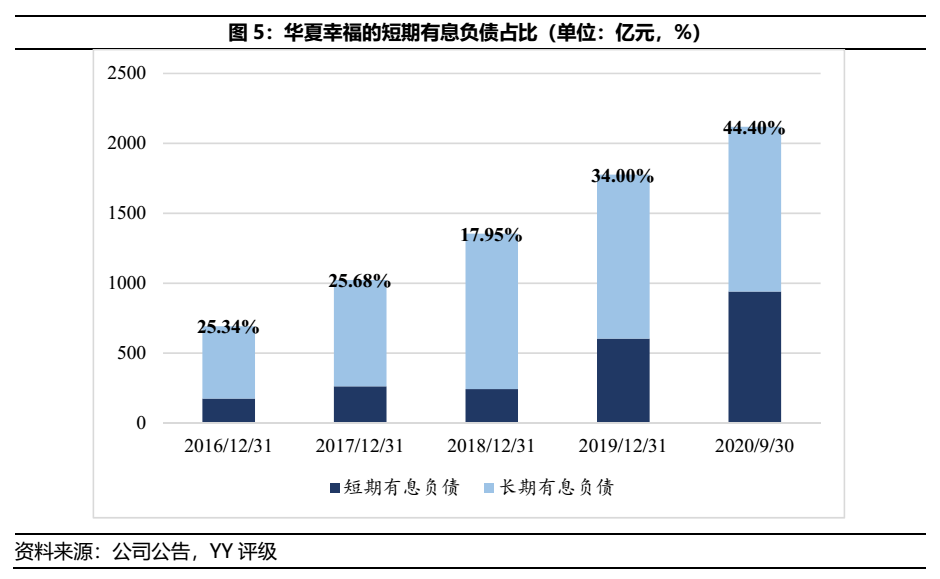 除了有息債務規模上升快速外,高風險業務模式和民企背景等因素限縮了華夏幸福融資渠道,導致其短期有息負債占比攀升快速。