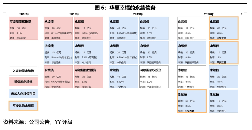 華夏幸福近年的永續債務(多為信托計劃認購)規模較大,16年至今(含已償還)共發行439億元,在上市主體披露規模為67億元(2020年9月末),其中多只債券(下圖藍色)或因為債務用途為華夏幸福子公司(九通基業、南京鼎通),而放于少數股東權益部份,需關注隱形的債務成本。其中,平安系公司共提供3只永續債,規模共計120億元。