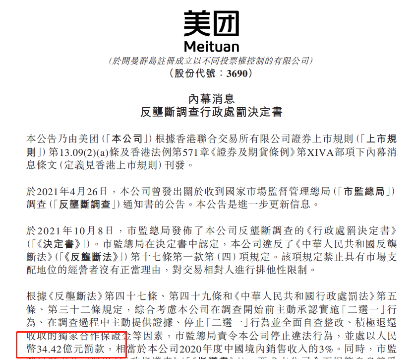 10月8日,國家市場監(jiān)管總局根據(jù)《中華人民共和國反壟斷法》第四十七條、第四十九條規(guī)定,綜合考慮美團(tuán)違法行為的性質(zhì),依法作出行政處罰決定,責(zé)令美團(tuán)停止違法行為,并處以其2020年中國境內(nèi)銷售額3%的罰款,計(jì)34.42億元。