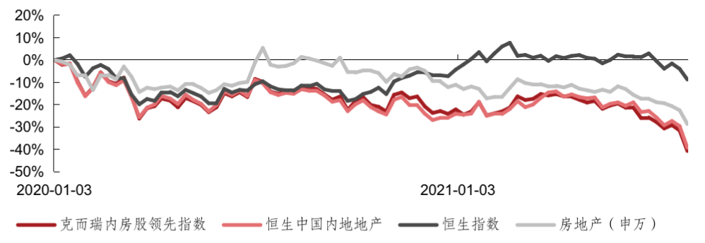 與之相對應的是,自去年以來A股、港股地產股整體表現低迷。克而瑞證券監測數據顯示,2020年1月1日至今,克而瑞內房股領先指數跌幅40.7%,同期恒生中國內地地產指數跌幅39.3%。