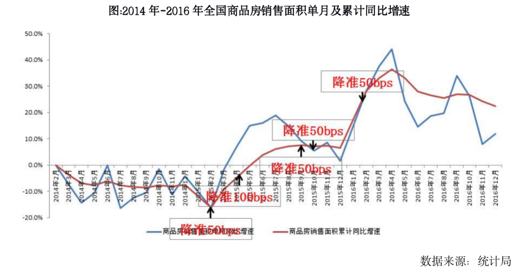 回顧央行每輪降準(zhǔn)周期,房地產(chǎn)行業(yè)或多或少均有所受益。典型如2015-2016年,央行連續(xù)5次降準(zhǔn),累計(jì)降準(zhǔn)300bps。受此影響,全國商品房銷售面積單月同比增速由2015年前2月谷底的-16.3%大幅回升至2016年4月峰值的44.1%。