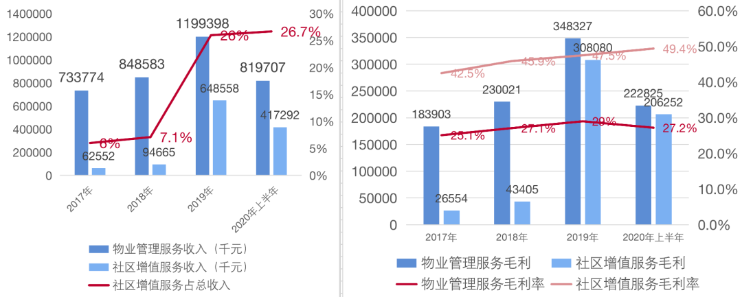 據世茂服務招股數(shù)據顯示,除了日益增長的基礎服務收入外,社區(qū)增值服務取得巨大增長。所得收入占總收入的百分比由2017年的6.0%上升至2018年的7.1%及2019年的26.0%,并進一步上升至截至2020年前六個月的26.7%。毛利率也由27.5%上升至33.7%。