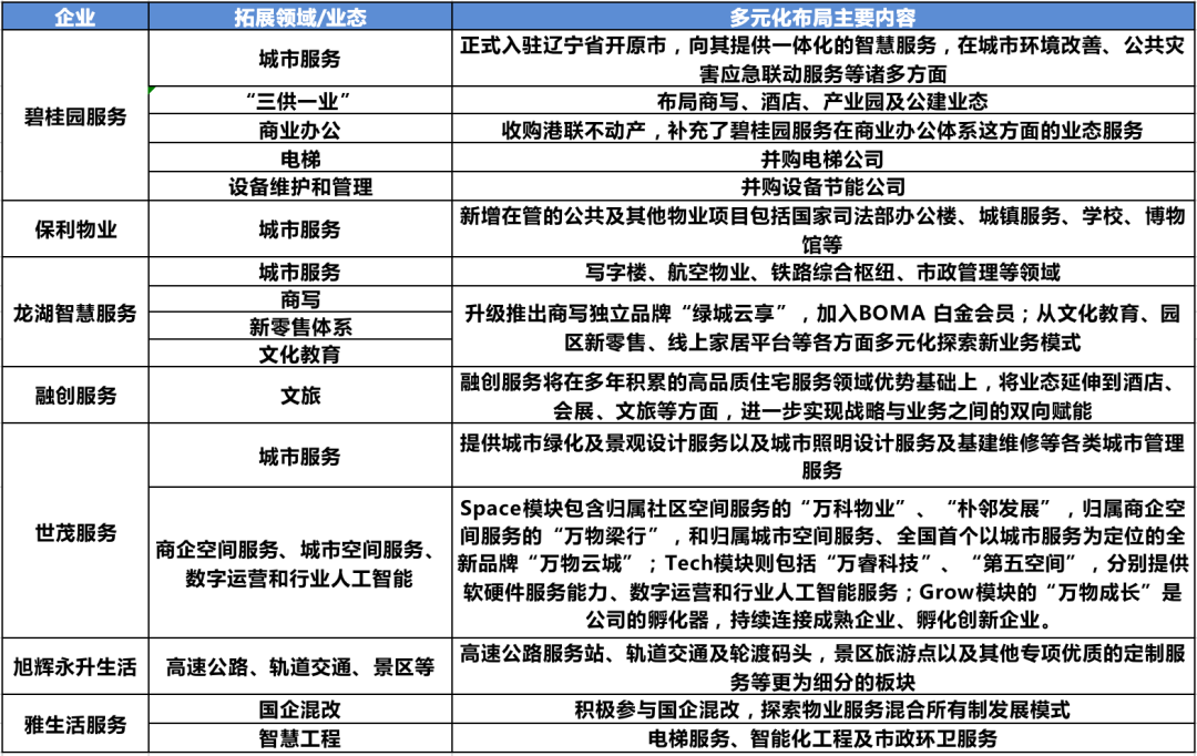 由于傳統(tǒng)物業(yè)行業(yè)發(fā)展的天花板,多元化的經營布局有利于持續(xù)釋放市場空間,這些領域具有細分賽道多,專業(yè)能力和門檻較高的特點,先進入者將具有先發(fā)優(yōu)勢,發(fā)展前景可期。