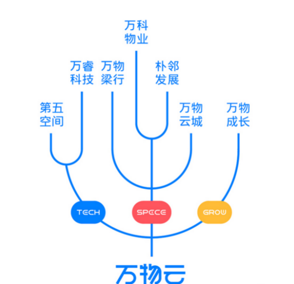 萬物云把原來的物業(yè)版塊一分為三,包含Space、Tech和Grow三大模塊。其中,Space模塊包含歸屬社區(qū)空間服務的“萬科物業(yè)”、“樸鄰發(fā)展”,歸屬商企空間服務的“萬物梁行”,和歸屬城市空間服務、全國首個以城市服務為定位的全新品牌“萬物云城”;Tech模塊則包括“萬睿科技”、“第五空間”,分別提供軟硬件服務能力、數(shù)字運營和行業(yè)人工智能服務;Grow模塊的“萬物成長”是公司的孵化器,持續(xù)連接成熟企業(yè)、孵化創(chuàng)新企業(yè)。