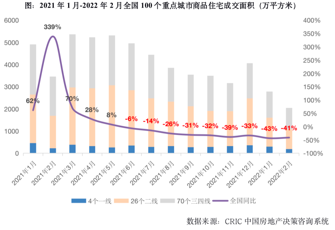 2021年下半年以來,房地產(chǎn)市場步入快速下行通道,樓市持續(xù)轉(zhuǎn)冷,百城成交量持續(xù)縮水,同比跌幅逐漸擴(kuò)大,2022年2月,全國100個重點(diǎn)城市商品住宅成交面積僅為2043萬平方米,創(chuàng)近兩年來單月新低,同比跌幅達(dá)到41%,三四線城市領(lǐng)跌,跌幅達(dá)46%。