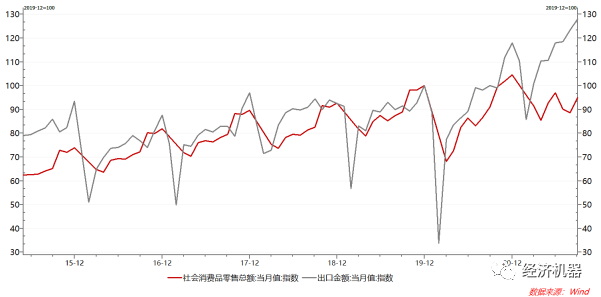 圖3、外需和內(nèi)需(社會零售銷售)表現(xiàn)(2019.12=100)