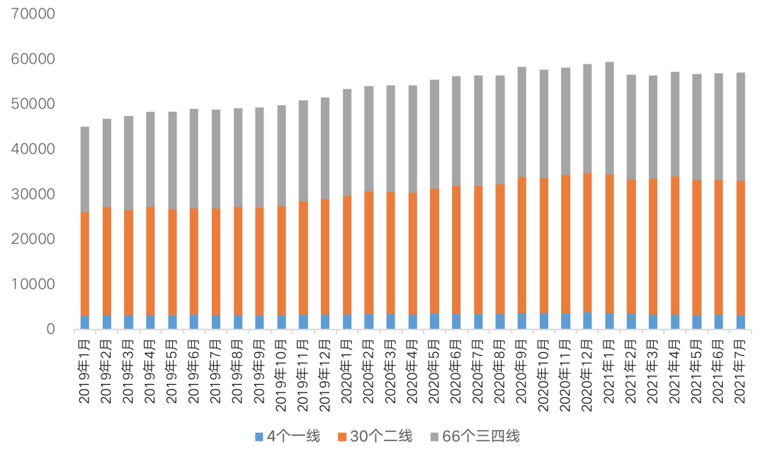 2021年以來,全國整體庫存穩(wěn)中有降,國家統(tǒng)計(jì)局公布數(shù)據(jù)顯示,7月末,商品房待售面積50864萬平方米,比6月末減少215萬平方米。其中,住宅待售面積減少270萬平方米,辦公樓待售面積減少26萬平方米,商業(yè)營業(yè)用房待售面積增加19萬平方米。