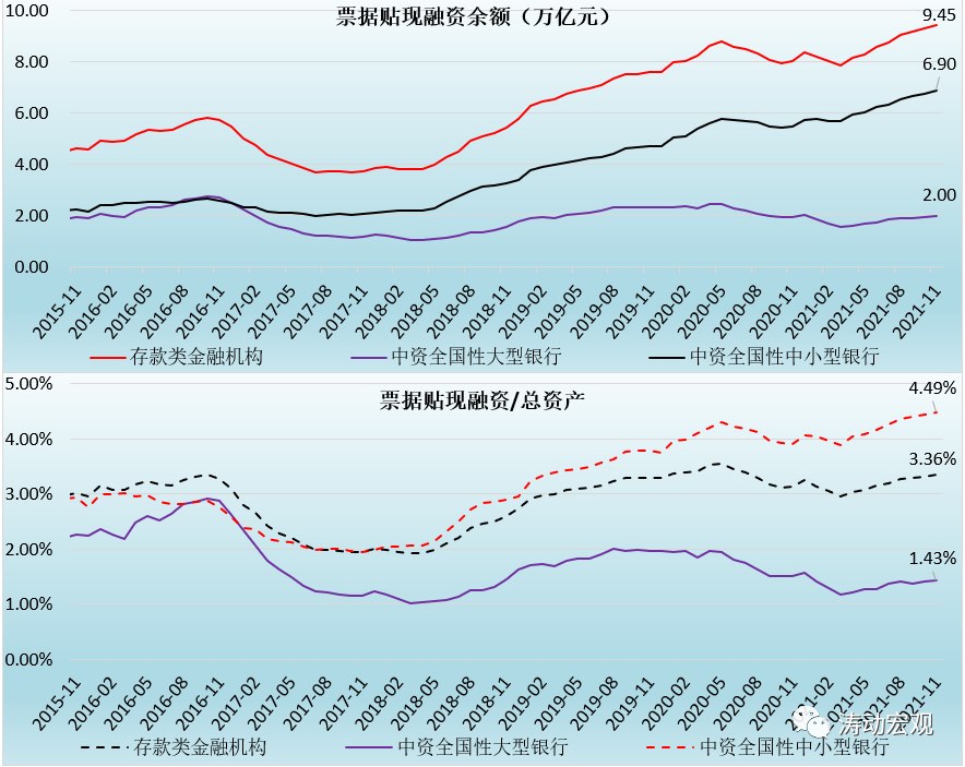 對于銀行承兌匯票數據的觀察可以從兩個指標來看,即社融指標的未貼現銀票和已貼現銀票,前者被視為表外融資部分(通過每月公布的社融指標來確定),后者則通常被視為銀行的表內業務(通過金融機構信貸收支表來確定)。具體看,截至2021年12月底,未貼現銀行承兌匯票余額達到3.01萬億,金融機構提供的票據貼現融資余額為9.85萬億(本外幣口徑)。其中,大型銀行和中小型銀行的余額分別為2.24萬億和7.09萬億。