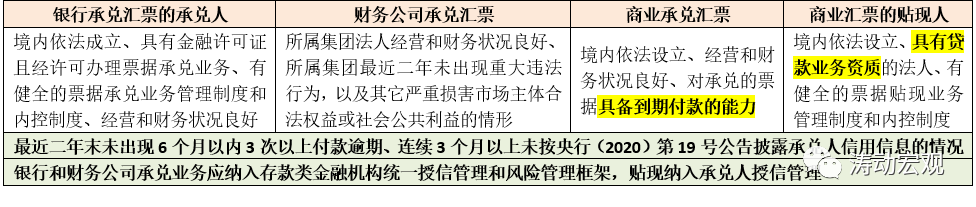 《征求意見稿》對銀票(含銀行和農信社)、財務公司承兌匯票(含財務公司及所屬集團)以及商票的承兌人提出了一系列要求。其中有一條是明確的,即承兌人最近二年末未出現6個月以內3次以上付款逾期、連續3個月以上未按央行(2020)第19號公告披露承兌人信用信息的情況。
