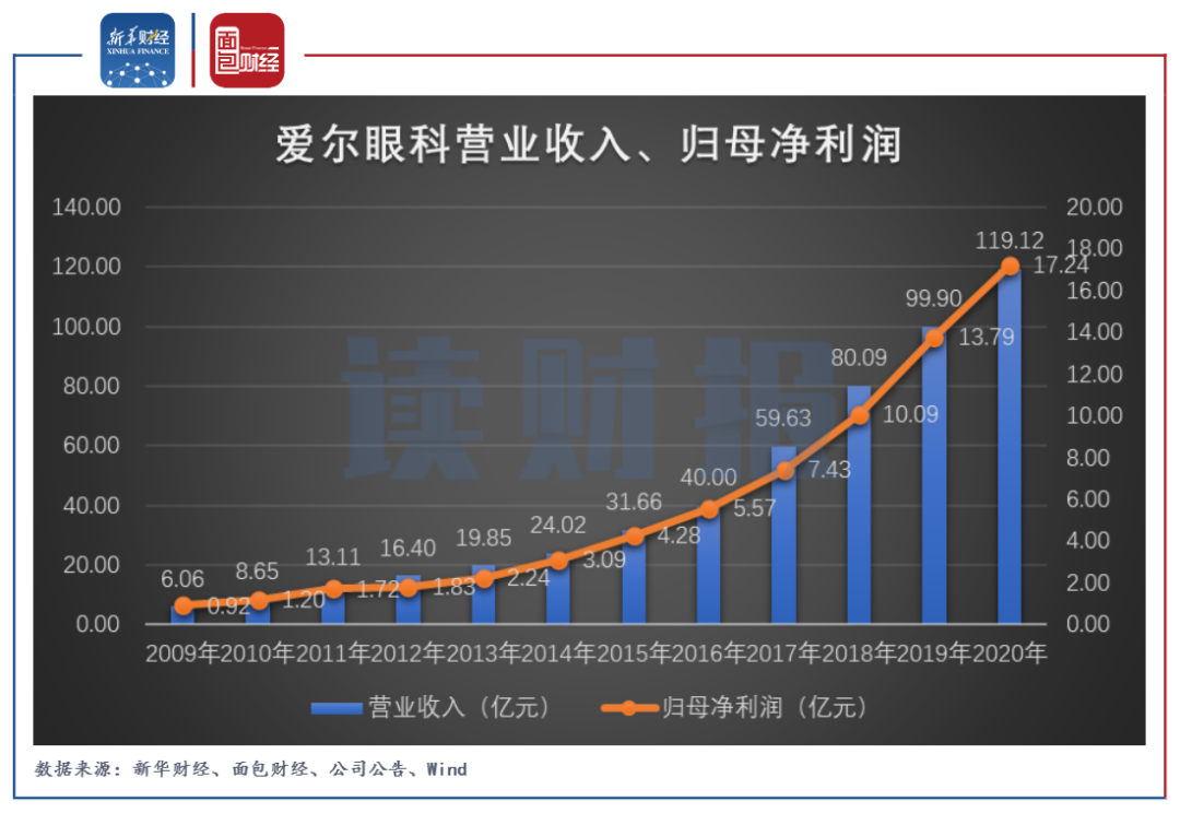 圖3:2009年至2020年愛(ài)爾眼科營(yíng)業(yè)收入、歸母凈利潤(rùn)
