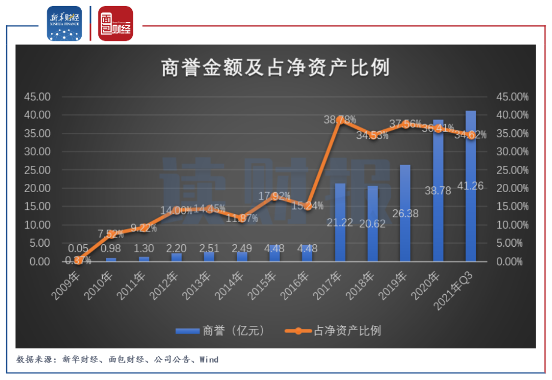 但另一方面,由于持續(xù)收并購(gòu)擴(kuò)張,愛(ài)爾眼科積累了大額商譽(yù)。數(shù)據(jù)顯示,公司的商譽(yù)金額由2009年時(shí)0.05億元上升至2021年第三季度末41.26億元。自2017年以來(lái),公司商譽(yù)金額占凈資產(chǎn)的比例持續(xù)高于30%。