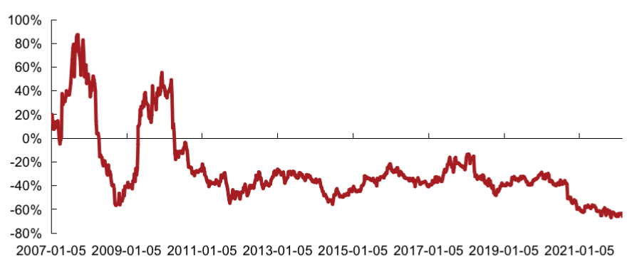 市凈率方面,克而瑞內房股領先指數成分股PB相對恒指成分股2月小幅震蕩,總體繼續下行并維持低位。2月相對恒指PB周均值為-0.9% ,低于上月的周均值-0.1%,低于2021年全年相對恒指PB周均值22.5%。