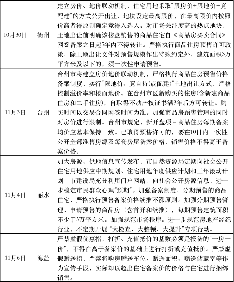 “十四五”規劃建議發布的同一天,浙江臺州升級了樓市調控,規定在臺州市區新購買的住房(含新建商品住房和二手住房),自取得不動產權證書滿3年后方可轉讓。麗水緊跟其后明確“四個加強”調控措施。