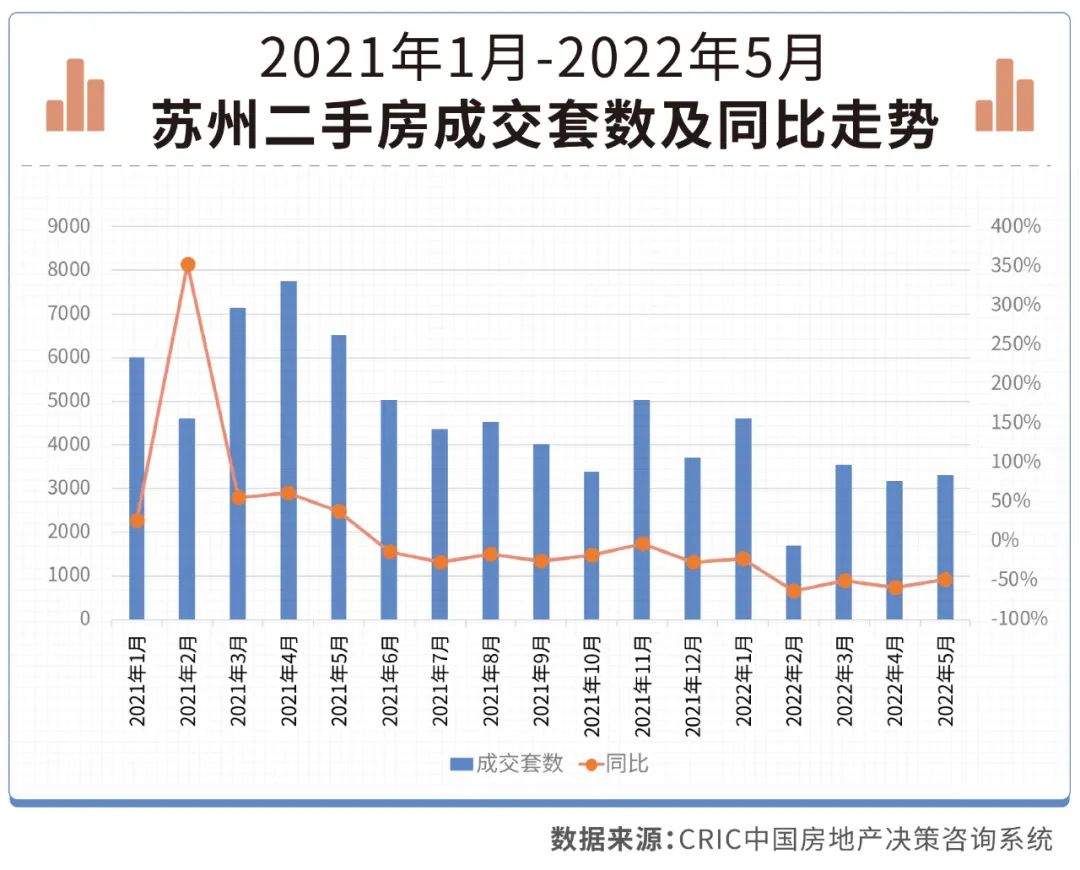 5月蘇州共成交3324套,環比增4.8%,同比降幅仍然達到49%,且成交套數已連續12個月下降。當前無論是成交面積還是成交套數,均處于2020年2月以來的低點。