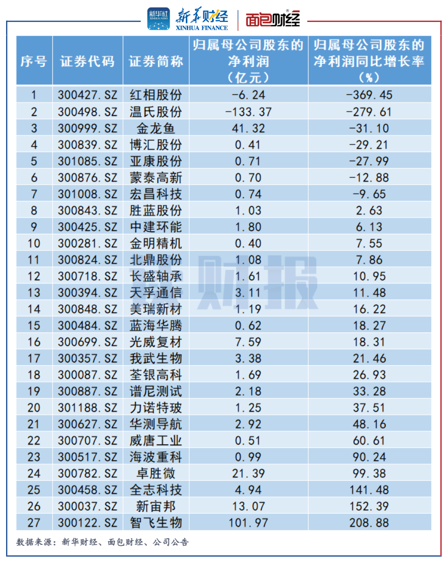 除了業(yè)績預(yù)告,截至2022年2月23日,創(chuàng)業(yè)板上市公司中有27家公司披露了2021年業(yè)績快報,其中溫氏股份、紅相股份兩家公司預(yù)計虧損。