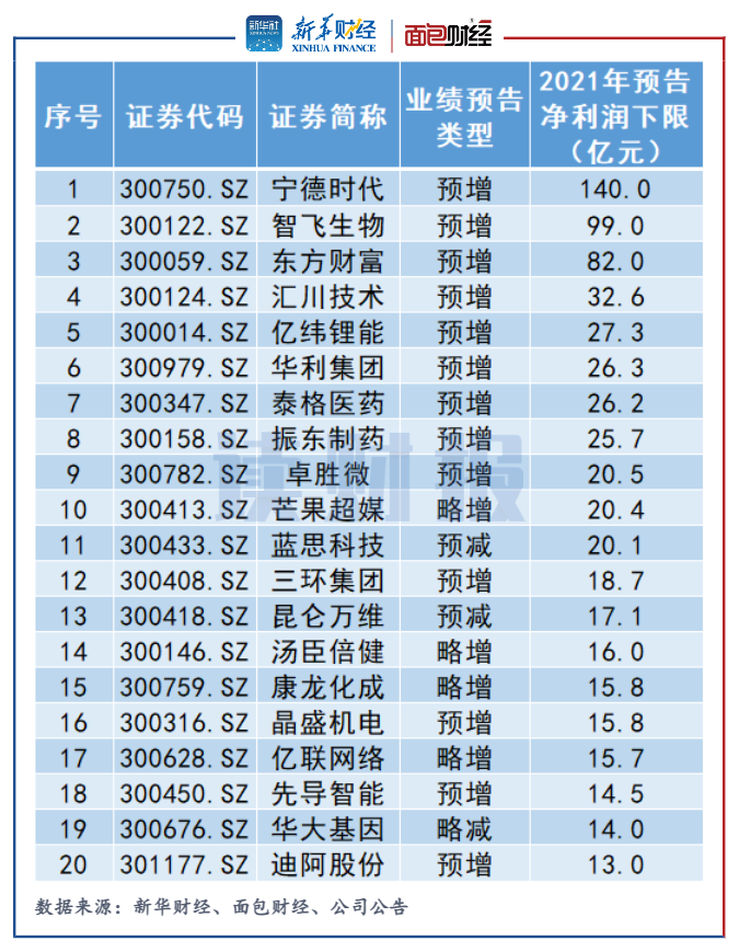 寧德時代、智飛生物和東方財富2021年度預(yù)計實現(xiàn)歸母凈利潤下限分別為140億元、99億元、82億元,在創(chuàng)業(yè)板上市公司中排前三甲。