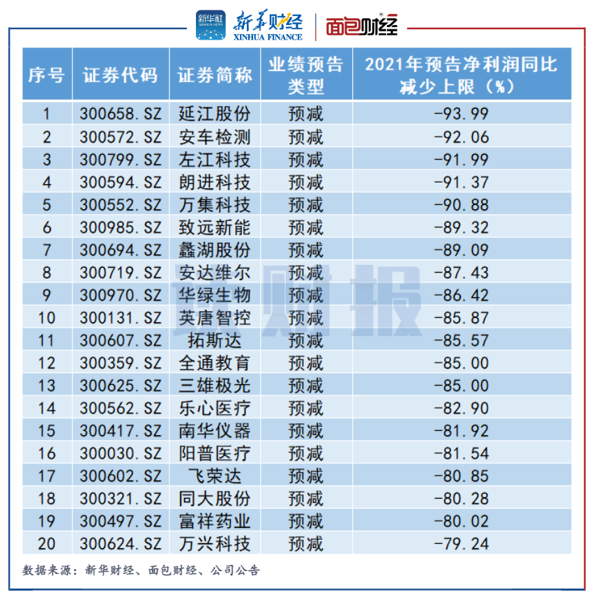 已發(fā)布業(yè)績預(yù)告的創(chuàng)業(yè)板上市公司中,共有127家2021年度歸母凈利潤預(yù)計同比下滑(剔除首虧)。按照預(yù)告歸母凈利潤同比下滑上限統(tǒng)計,延江股份、安車檢測、左江科技2021年度歸母凈利潤同比分別下滑93.99%、92.06%、91.99%,是創(chuàng)業(yè)板中歸母凈利潤降幅最大的三家公司。
