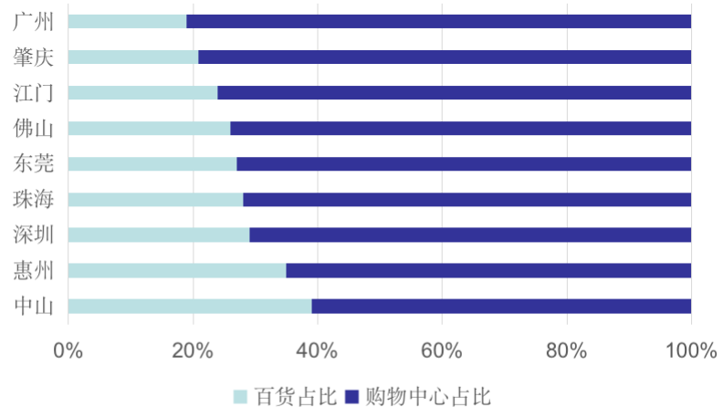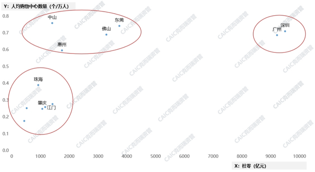 從城市人均購物中心數量和社零的對比來看,廣州、深圳社零基本面較好,城市整體商業(yè)面積仍未滿足人口消費需求,天花板較高,商業(yè)仍有發(fā)展空間。而中山、惠州、佛山、東莞市場飽和已顯現,珠海、肇慶、江門仍處于購物中心稀缺階段。
