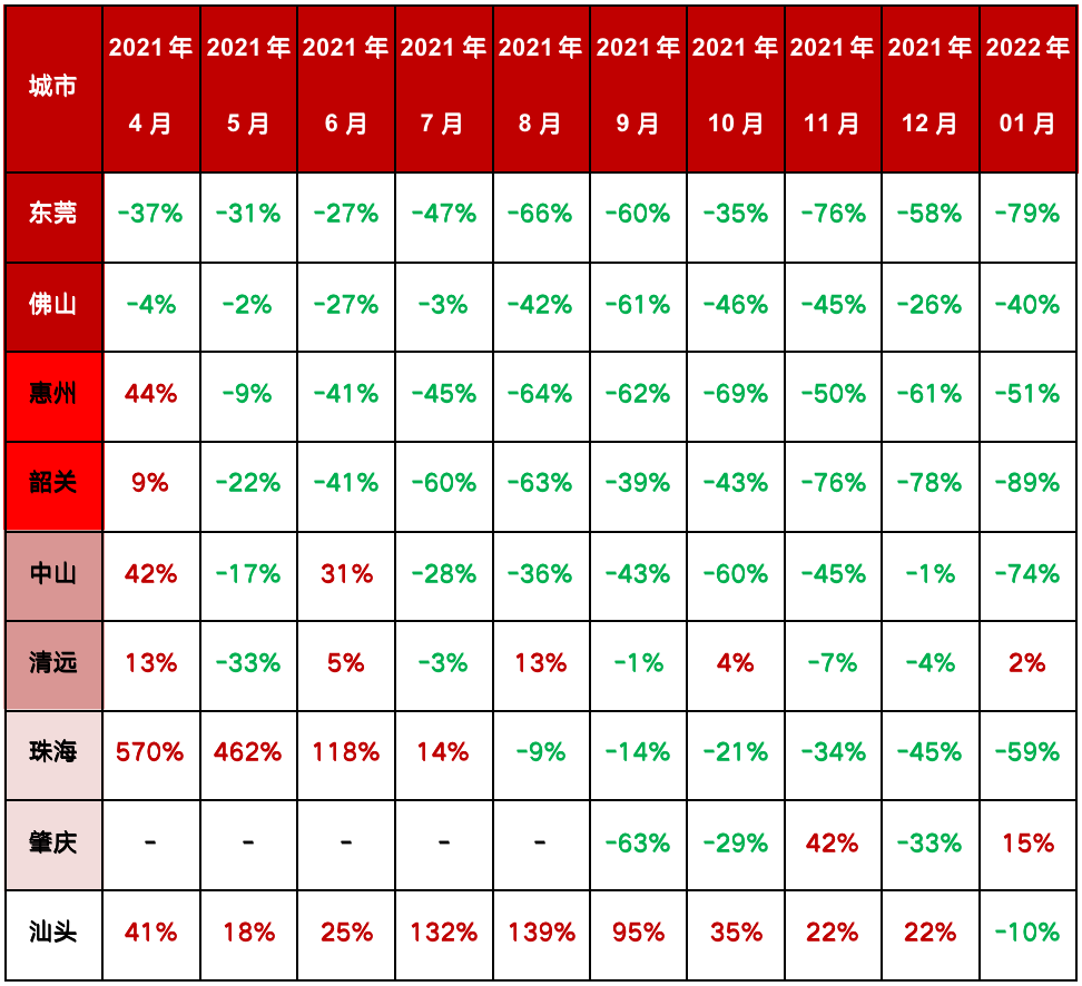從2021年4月-2022年1月珠三角主要城市住宅銷售面積同比情況看,市場快速向外圍低能級城市傳導。