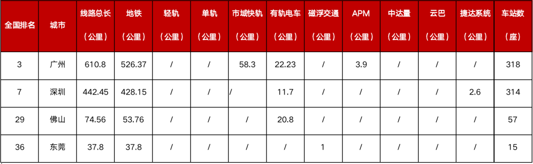 2021年廣州以線路總長610.8公里位列全國第三位,深圳以442.45公里位于第七位,東莞線路總長不足50公里,惠州、中山、江門、珠海、肇慶尚未開通運營城市軌道交通。