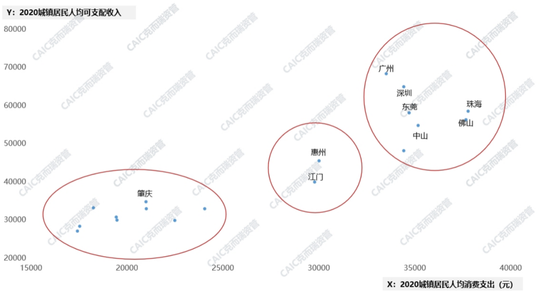 廣州、深圳、東莞等城市組團的人均可支配收入、人均消費支出也很高,屬于“有錢肯花”的城市,消費旺盛,商業(yè)發(fā)展?jié)摿ψ恪6貞c等低能級城市消費水平則顯著較弱決定了在這些城市做商業(yè)的風險和天花板。
