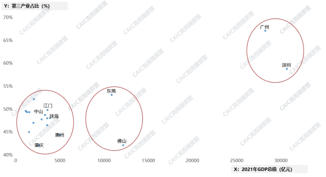 2022年,廣東省“一核一帶一區(qū)”區(qū)域發(fā)展新格局基本確立,其中由韶關、梅州、清遠、河源、云浮組成的北部生態(tài)發(fā)展區(qū)將嚴格控制開發(fā)強度,著力發(fā)展現代農業(yè)、休閑旅游、綠色低碳產業(yè),承接發(fā)展引擎區(qū)產業(yè)轉移的可能性較小。我們關注的九個城市雖然定位為廣東省的發(fā)展引擎,但廣深仍遠超其他城市,莞佛位于第二梯隊,其他城市均無突出表現,身為“引擎”,未來產業(yè)發(fā)展仍需提速。