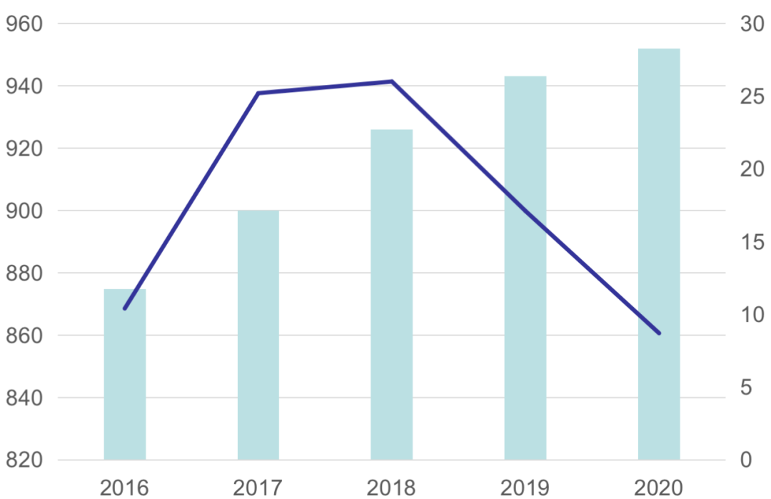 圖:2016-2020佛山常住人口及凈增(萬人)