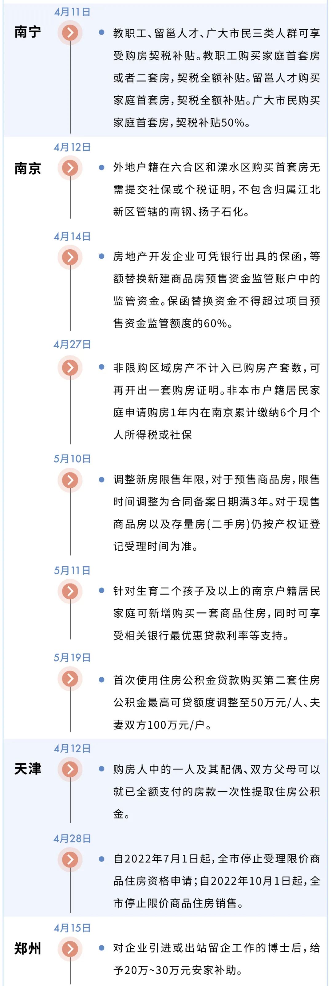 4月以來,南京至少發布6次樓市松綁政策試探政策底線,并于5月20日發布“南京二手房全面取消限購”的政策內容,但僅維持半天,便被緊急叫停,這也是4月以來為數不多的政策“一日游”。