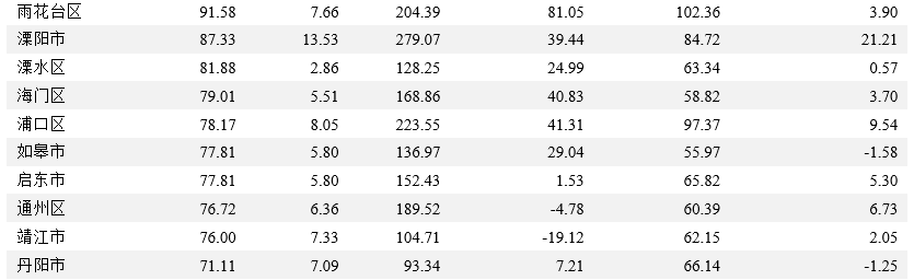 經濟情況:2021年江蘇省13個地級市GDP排位順序未發生變化,蘇州、南京和無錫GDP規模依舊處于領跑地位;95個區縣中除邗江區外,其他區縣GDP規模均有所提升。2021年江蘇省13個地級市GDP規模均有所上升,且順序排位未發生變化,蘇州、南京和無錫GDP規模依舊處于頭部,三者GDP總和占江蘇省GDP的45.61%,2021年江蘇省大部分區縣GDP規模較2020年有所提升,但2021年邗江區GDP規模小幅下滑至1,117.29億元,響水縣GDP增速下滑0.1個百分點至6.0%。