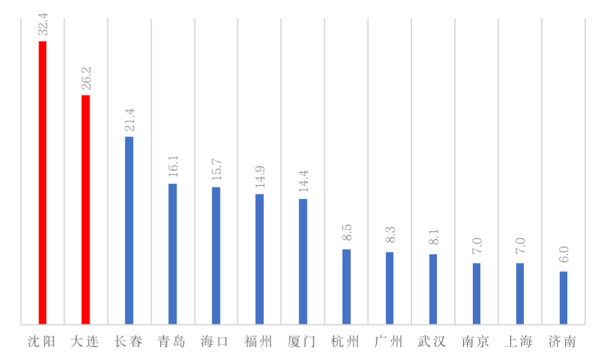 從區(qū)域分布來看,這些城市多以北方二線城市為主,近年來經(jīng)濟(jì)發(fā)展速度相對(duì)沿海二線較慢,高收入的新興產(chǎn)業(yè)發(fā)展速度較慢,因此在人才爭奪戰(zhàn)中也處于下風(fēng),如天津、濟(jì)南、長春和哈爾濱等城市近十年大學(xué)生比例漲幅均處于二線城市下游。在此影響下,這些城市的房價(jià)上漲動(dòng)力也比較薄弱,整體增速偏緩,如哈爾濱2020年商品住宅成交均價(jià)仍未破萬,近十年房價(jià)復(fù)合增長率僅有6%。
