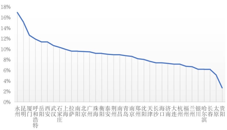 2、“低位緩增”型:大學(xué)生占比低于20%的城市,主要以三線城市為主,但哈爾濱、石家莊、福州等二線城市也均在列。