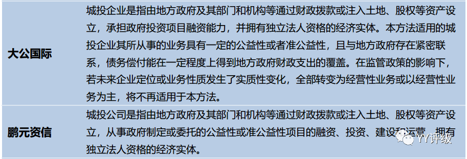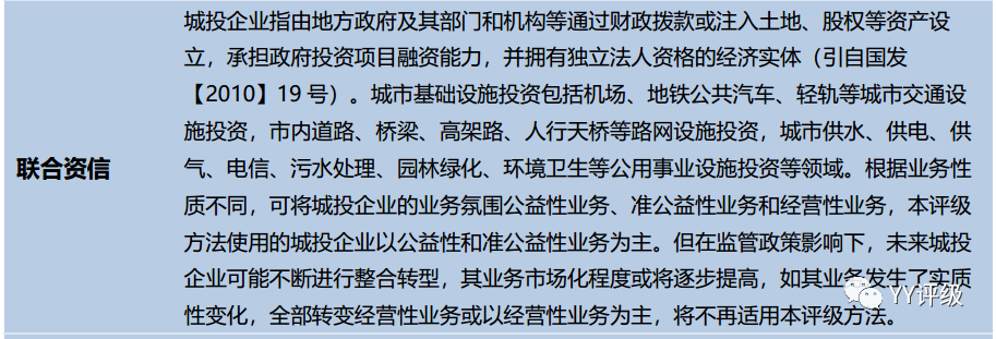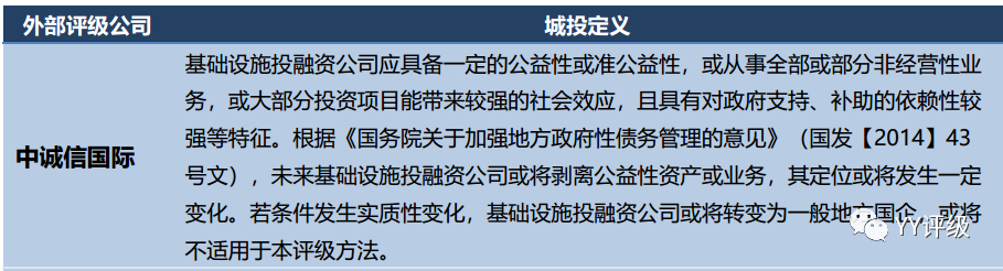 在考慮城投公司起源的基礎(chǔ)上各家評級公司也對各自定義了自己評級方法里的城投公司。基本上,中資評級公司對城投平臺的定義都是根據(jù)相關(guān)的政府文件來的,但是也有各家評級公司的自身的理解在里面,其中中誠信國際給城投公司命名為基礎(chǔ)設(shè)施投融資公司,突出了城投公司的職能;聯(lián)合資信和東方金誠細(xì)化了城市基礎(chǔ)設(shè)施投資的范圍;并且大部分評級公司都考慮了城投公司轉(zhuǎn)型的問題,強(qiáng)調(diào)如果城投公司的定位和業(yè)務(wù)范圍發(fā)生變化,將不適用于城投公司的評級方法。具體各家中資評級公司對城投公司的定義見下表: