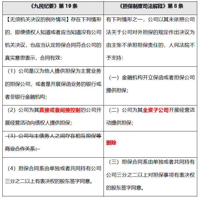 《九民紀要》第19條規定了四種“無須機關決議的例外情況”,但《擔保制度司法解釋》第7條對這些例外情況進行了極大的縮減,具體對比如下: