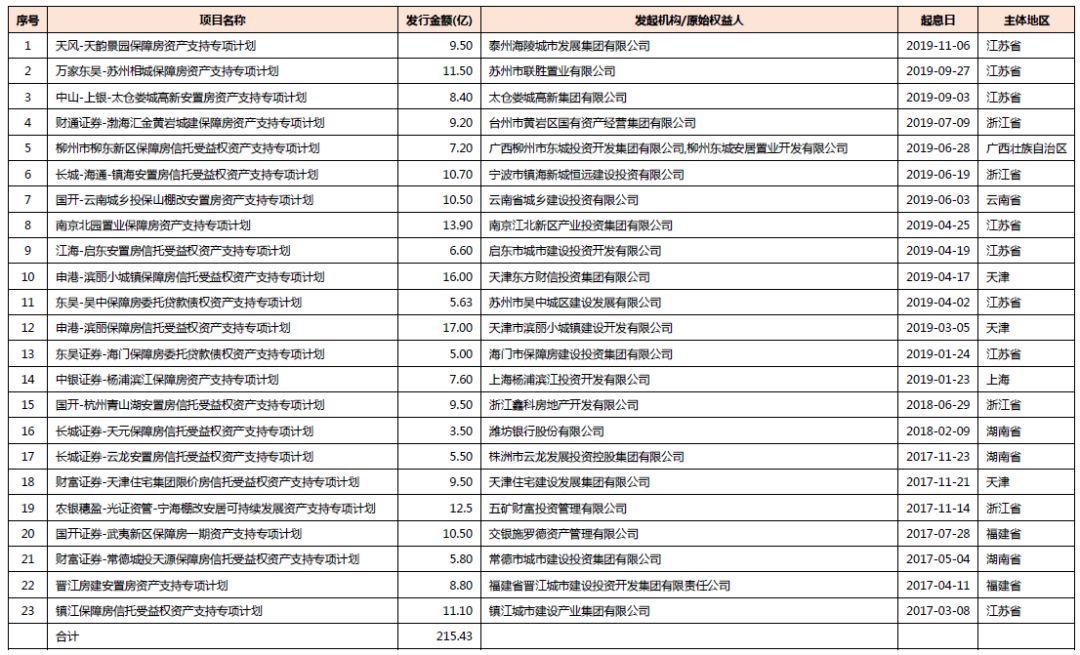 2017年至今,市場共成功發(fā)行23單保障性住房ABS,總募集資金規(guī)模為215.43億元,項目明細如下: