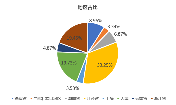 通過下圖可以發(fā)現,2019年保障性住房ABS較過往幾年出現了非常大的增長,截至2019年11月末,發(fā)行金額已經超過過去兩年之和。在地區(qū)分布方面,江蘇、浙江和天津位列前三,三個地區(qū)占比已經超過70%。