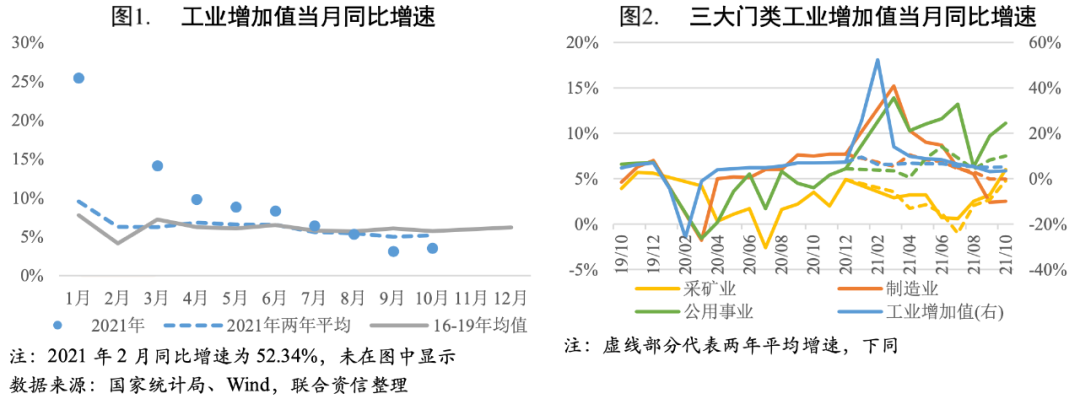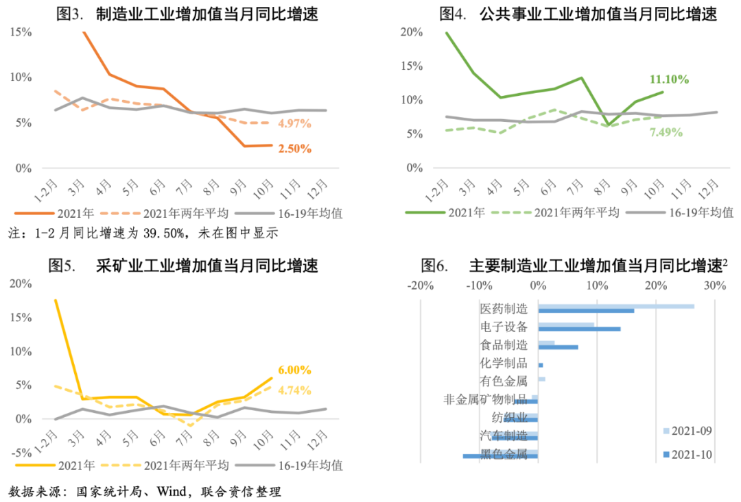主要行業(yè)方面,10月醫(yī)藥制造業(yè)工業(yè)增加值仍保持15%以上的較快同比增速,但增速較上月有所回落;受季節(jié)性需求增加、為電商促銷和海外圣誕季積極備貨等因素帶動,電子設(shè)備制造、食品制造等行業(yè)工業(yè)增加值同比增速提升明顯;非金屬礦物制品、黑色金屬冶煉及壓延加工業(yè)、汽車制造業(yè)、紡織業(yè)工業(yè)增加值同比增速繼續(xù)下滑,其中非金屬礦物制品、黑色金屬冶煉及壓延加工業(yè)主要受到環(huán)保限產(chǎn)、地產(chǎn)端降溫的影響,汽車制造產(chǎn)能擴張承壓仍然主要受限于芯片短缺因素,紡織業(yè)主要是上年同期基數(shù)較高所致。