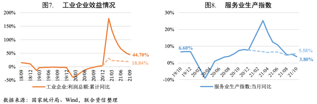 2021年10月,我國多項經(jīng)濟指標出現(xiàn)改善跡象。生產(chǎn)端,10月工業(yè)增加值同比增速和兩年平均增速[1]結(jié)束下行趨勢,企穩(wěn)反彈,主要是受到能源保供政策發(fā)力拉動。需求端,固定資產(chǎn)投資增速繼續(xù)放緩,主要是受房地產(chǎn)和基建投資增速放緩?fù)侠郏圃鞓I(yè)投資在出口帶動下維持高增長;消費在假日和價格雙重因素的影響下,延續(xù)小幅改善趨勢,預(yù)計11月電商促銷活動疊加失業(yè)率下降帶來的居民可支配收入的增加將繼續(xù)提振消費,但十月下旬以來多地疫情散發(fā)將拖累消費修復(fù);出口在外需、出口替代以及價格的支撐下,保持較強的韌性,年內(nèi)出口增速有望保持在較高的水平。整體看,雖然10月多項經(jīng)濟指標均出現(xiàn)改善的信號,但疫情對消費產(chǎn)生擾動,房地產(chǎn)投資仍將維持下行趨勢,環(huán)保和高能耗行業(yè)限產(chǎn)以及冬季極端氣候現(xiàn)象或?qū)I(yè)生產(chǎn)產(chǎn)生拖累,年內(nèi)經(jīng)濟仍存在下行壓力。