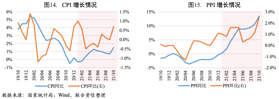 受國際輸入性因素疊加國內(nèi)主要能源和原材料供應(yīng)偏緊影響,10月PPI漲幅再次擴大。10月PPI同比增幅較9月擴大2.80個百分點至13.50%,創(chuàng)歷史最高值。其中,生產(chǎn)資料價格上漲17.90%,漲幅擴大3.70個百分點,主要是受國際價格上漲疊加國內(nèi)主要能源和原材料供應(yīng)偏緊影響;生活資料價格上漲0.60%,漲幅擴大0.20個百分點。從環(huán)比看,PPI漲幅較9月擴大1.30個百分點至2.50%。近期煤炭、鋼材等價格下行,疊加國內(nèi)大宗商品價格控制政策、北方建筑工業(yè)停工導(dǎo)致黑色金屬需求減弱,或?qū)?1月PPI下行,PPI-CPI剪刀差收窄,中下游企業(yè)盈利情況或?qū)⒑棉D(zhuǎn)。