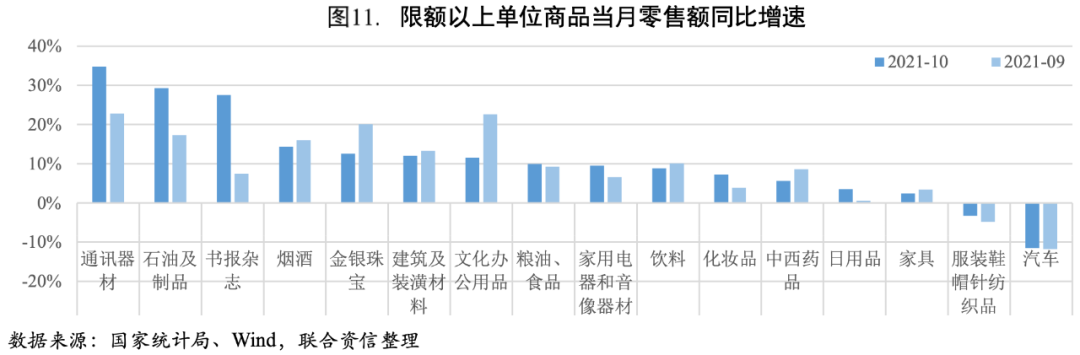 商品零售小幅增加,餐飲收入增速小幅回落。10月商品零售同比增速較上月上升0.7個百分點至5.20%,增速仍低于疫情前水平。汽車消費繼續(xù)負增長,是拖累商品零售的一大因素;通訊器材、石油及制品和書報雜志增速均在25%以上,且較上月顯著增長;服裝鞋帽針紡織品零售額增速降幅雖有收窄但依然為負。餐飲收入增速小幅回落,餐飲收入增速較9月下降1.1個百分點至2.00%,預(yù)計11月受疫情影響,餐飲收入增速會有所下降。