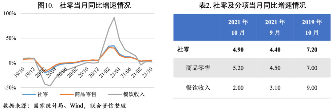 國慶假期效應(yīng)提振消費,但疫情和天氣因素制約修復(fù)進程。2021年10月社會消費品零售總額(下稱“社零”)增長4.90%,連續(xù)第二個月回升;環(huán)比增長0.43%,較上月小幅提升。社零同比和環(huán)比增速小幅回升主要是受益于國慶假期消費帶動,同時價格因素也是推升社零增速的原因之一。但天氣以及疫情制約社零的修復(fù),社零同比和環(huán)比增速較疫情前水平尚有修復(fù)空間。預(yù)計11月電商促銷活動疊加失業(yè)率下降帶來的居民可支配收入的增加將繼續(xù)提振消費,但十月下旬以來多地疫情散發(fā)將拖累消費修復(fù)。