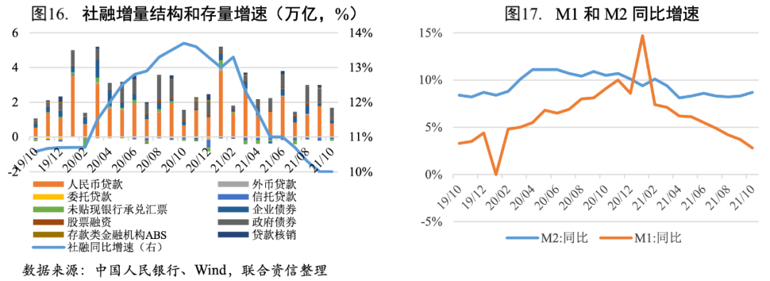社融存量同比增速與上月持平,人民幣貸款和政府債券融資是主要支撐。2021年10月新增社融1.59萬億元,同比多增1971億元,三個月以來首次轉(zhuǎn)正;社融存量增速為10%,與9月持平。從社融結(jié)構(gòu)來看,10月新增人民幣貸款和政府債券融資同比分別多增1089億元、1236億元,是社融的主要支撐項;新增委托、信托貸款和未貼現(xiàn)銀行承兌匯票共-2120億元,非標融資規(guī)模持續(xù)萎縮;其他分項同比變化不大。在政府債發(fā)行與上年錯期的影響下,疊加房企融資政策邊際松動,以及9月底央行宣布年內(nèi)新增的3000億小微再貸款額度逐步落地,對企業(yè)貸款也會形成一定支撐,預(yù)計11、12月社融增速將會有所回升。