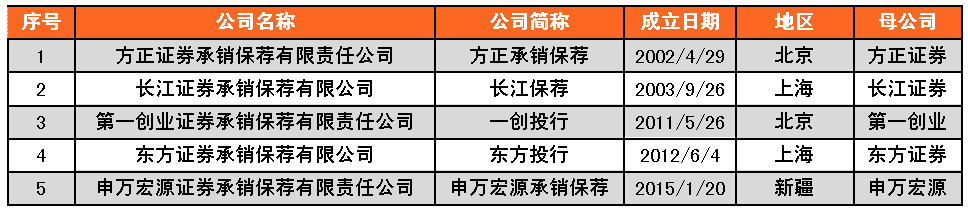 √ 券商投行子公司有5家,北京、上海各2家,新疆1家。其中除申萬宏源承銷保薦外,其他三家投行子公司的母公司均為上市公司,東方投行母公司東方證券為A+H上市公司。