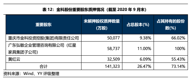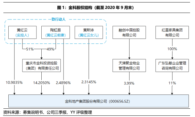 2016年融創(chuàng)通過定增成為金科第二大股東,開啟了黃紅云與融創(chuàng)長達4年多的股權(quán)之爭,直到2020年4月公司公告稱融創(chuàng)的子公司將所持11%的金科股權(quán)轉(zhuǎn)讓給紅星家具集團,這場繼“寶萬之爭”后地產(chǎn)行業(yè)最出名的“控制權(quán)之爭”才偃旗息鼓。隨后,融創(chuàng)系公司進一步減持,截至2020年9月末,黃紅云及其一致行動人—前妻陶虹遐、女兒黃斯詩直接和間接持有公司共計29.99%的股份,紅星家具集團下的廣東弘敏持股11%,融創(chuàng)僅通過天津聚金持股3.99%,至此,黃紅云以相對明顯的持股優(yōu)勢保住了對金科的實際控制權(quán)。