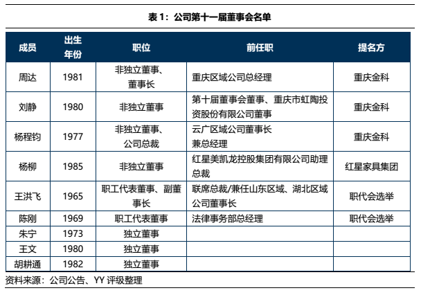 公司于2021年1月29日股東大會通過的新一屆董事會名單耐人尋味,四位非獨立董事中金科方占三席,紅星家具集團占一席,無融創(chuàng)的身影。原董事長蔣思海和總裁喻林強均離開董事會,換上了周達和楊程鈞。此外,核心崗位董事長及總裁同時發(fā)生更換,原金科董事長、60后的金科元老蔣思海退居二線,僅擔(dān)任公司名譽董事長;原金科總裁喻林強回歸大本營,調(diào)任金科重慶區(qū)域公司董事長兼總經(jīng)理。而此前市場揣測“黃紅云回歸”并沒有發(fā)生,而是80后的重慶區(qū)域總經(jīng)理周達走向臺前。金科表示任命是基于“年輕化、專業(yè)化、知識化”的原則,并為匹配金科戰(zhàn)略發(fā)展目標的實現(xiàn)而做出的決定。