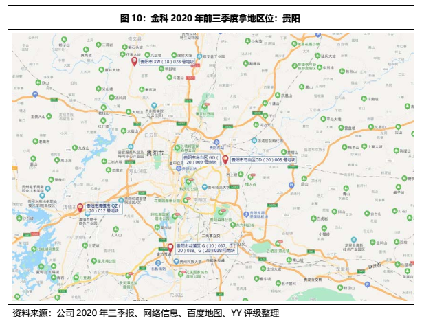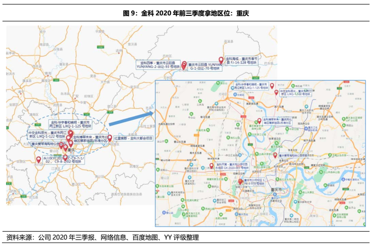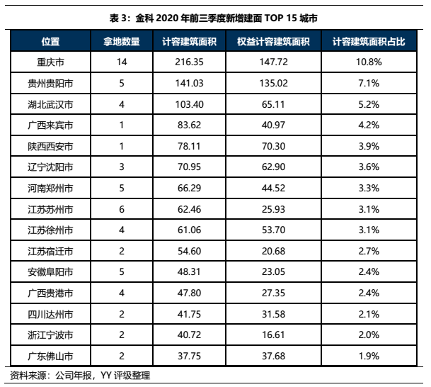 截至2020年9月末,金科土地儲備剩余可售建筑面積(全口徑)約7,902萬平方米,口徑為在建未售面積、竣工未售面積和待開發(fā)面積之和,土儲較實,按公司2020年2,240萬平方米的銷售建面估算,可供未來3年半銷售。我們結(jié)合各城市近期新房均價和公司2020年銷售均價進行估算,對應(yīng)貨值約8,759.08億元,充裕的土儲是公司逆勢擴張的底氣。