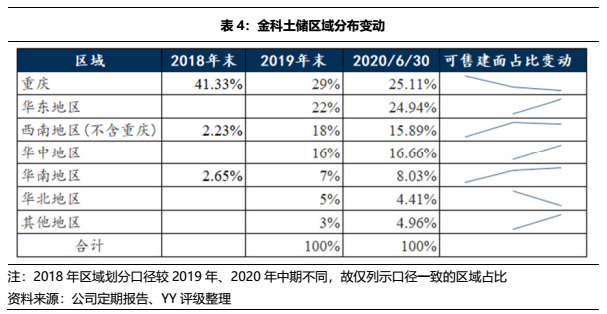因公司近年拓展上弱化重慶、增加其他區(qū)域布局,公司存量土儲中重慶占比逐漸減少,2018年末尚有40%,至2020年中將至約四分之一;與此同時,華東地區(qū)、重慶以外的西南地區(qū)、華南地區(qū)的占比均明顯上升,可見公司一方面將布局重心由重慶延展至大西南地區(qū)(合計占比41%),另一方面積極外拓,分散化程度提高,有利于抵御單城市政策調(diào)控帶來的經(jīng)營風(fēng)險。