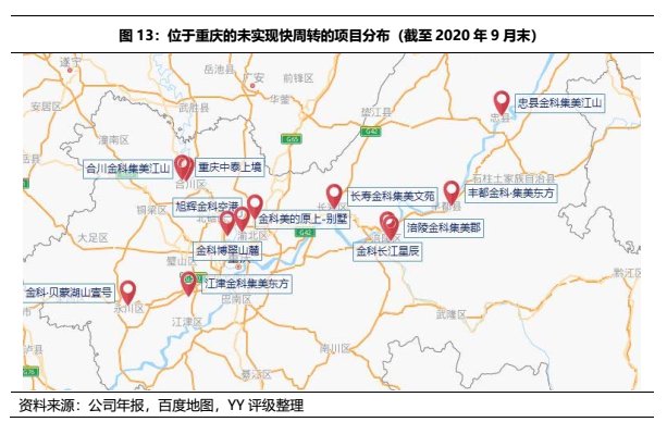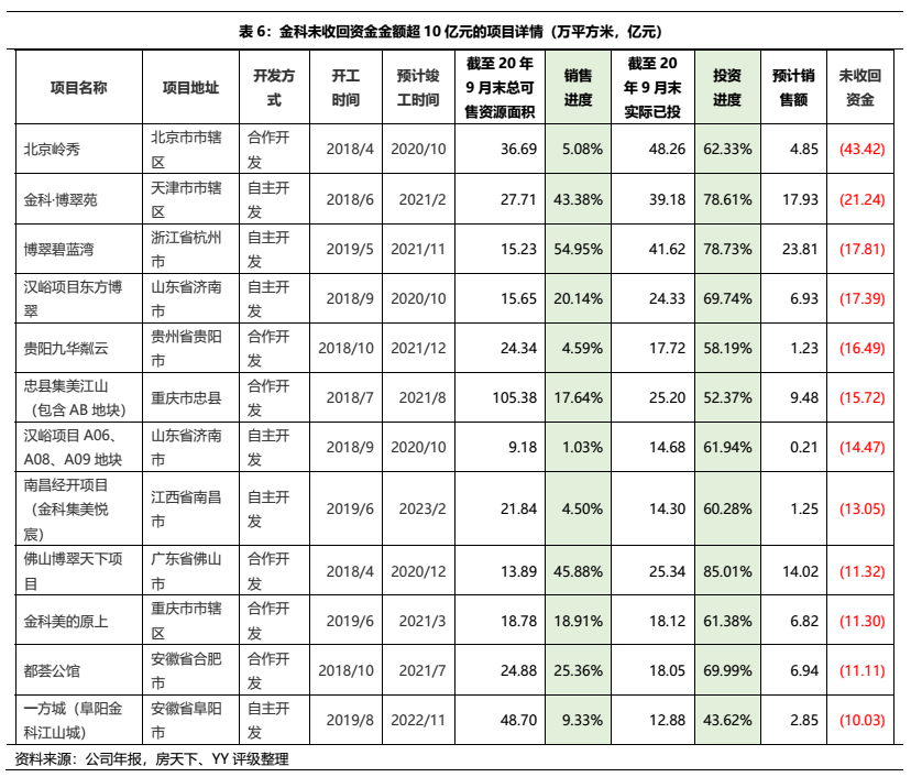 站在2020年9月末時點看,開工時間已超過1年的項目有179個,其中近四成項目未實現(xiàn)現(xiàn)金流回正,合計未收回的投入資金約396億元。考慮到部分項目分期開盤,存在現(xiàn)金流回流后投入到新一期開發(fā)的情況,故以上數(shù)據(jù)有被高估的可能性。下表列示了未收回資金較大(超過10億元)的項目,銷售進度均遠低于投資進度,未收回資金共約203億元,這部分項目去化壓力不小。這其中既有項目產(chǎn)品和區(qū)位的問題,也有項目體量超出城市能級的問題,如北京嶺秀項目地處北京市6、7環(huán)左右的平谷區(qū),卻是別墅大盤,2018年7月開盤,銷售進展緩慢,截至2020年9月末,未收回資金約43億元。又如忠縣集美江山,位于距離重慶主城210公里的忠縣,項目總可售面積達到105萬平米,銷售進度僅17%,消化較為吃力。