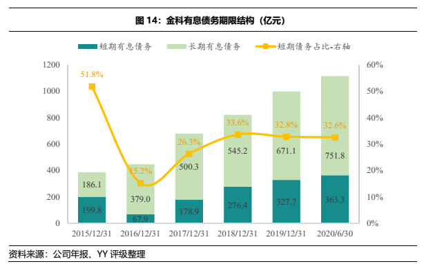 期限結(jié)構(gòu)方面,2015年短期債務(wù)占比較高,之后降至合理水平,2020年6月末短期債務(wù)363.3億元,占有息債務(wù)比重為32.6%。