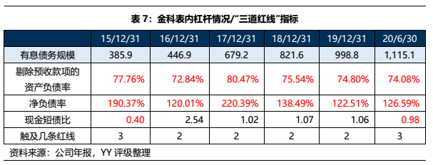 金科有息債務(wù)持續(xù)增長,截至2020年6月末,有息債務(wù)規(guī)模達1,115.1億元,剔除預(yù)收款項的資產(chǎn)負債率為74.08%,凈負債率為126.59%,現(xiàn)金短債比為0.98,三道監(jiān)管紅線全踩,按規(guī)定指標達標前有息債務(wù)不得增加。