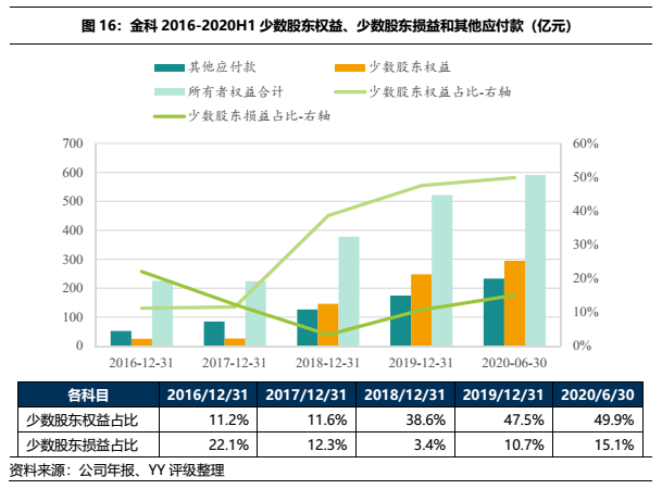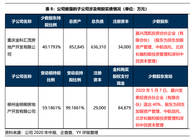 公司2020年中報僅披露了兩家重要的非全資并表子公司,其中金科匯茂的少數(shù)股東為投資合伙企業(yè),涉嫌明股實債,按少數(shù)股東認繳注冊資本測算為1.37億元。其他非全資并表子公司雖未披露,但對本期所有者權(quán)益份額發(fā)生變化的子公司進行追溯,發(fā)現(xiàn)子公司柳州金明柳的少數(shù)股東中有資金方于本期退出,公司為此支付8.49億元現(xiàn)金,疑為回購明股實債,所以可推測公司未披露的子公司中應(yīng)隱藏了更多明股實債情況。
